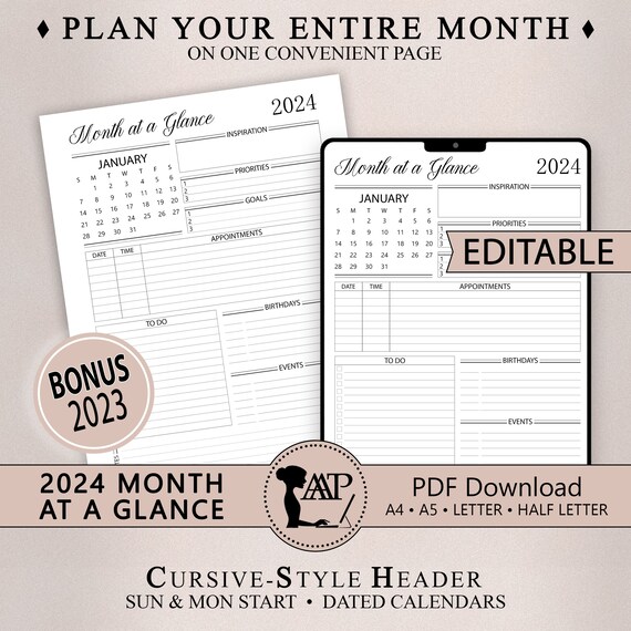 2024 Month at a Glance Planner Printable Digital Monthly Etsy