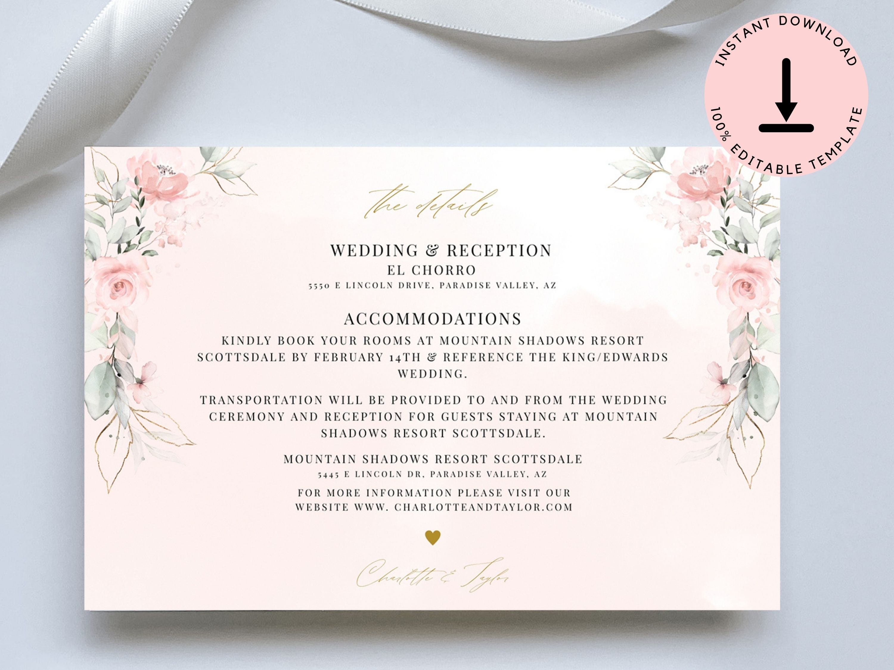 Blush Roses Wedding Invitation Details Card Template Wedding Etsy